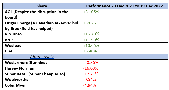 Counter intuitively after a much disrupted year, the ASX200 was only down -2.17% in the twelve months, 20 Dec 2021 to 19 Dec 2022. Different sectors within the market had very different results.