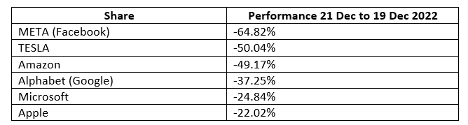 For the twelve months to 19 Dec 2022, the US S&P 500 Index is down -15.67%. The big losers were in the technology sector with the NASDAQ (Tech Index) down -28.54%.