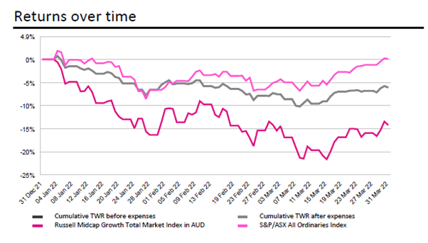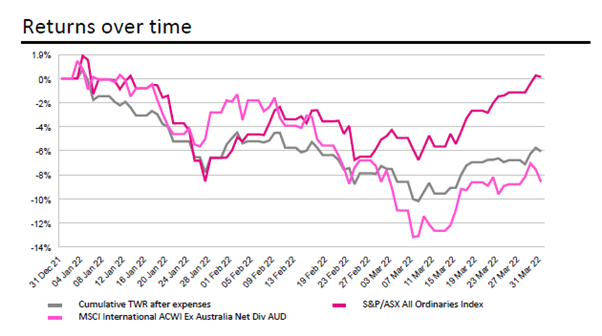 The graph below shows the comparison between the Australian and International markets, and the AAN Core model, from 1 January 2022 – 31 March 2022 (grey line is the AAN Core model returns). As you can see, there has been quite a discrepancy between Australian Shares and the ‘Rest of the World’ for this start of 2022.