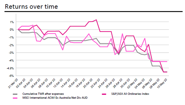 In the below graph the period 1 April 2022 to 9 May 2022 is displayed so you can see the outperformance that was evident at the start of the year is now less pronounced, with the relationship between the Australian market and the ‘Rest of the World’ more in sync. This was also the period when fixed income components of the model started to really feel the short-term negative return squeeze (see commentary below).
