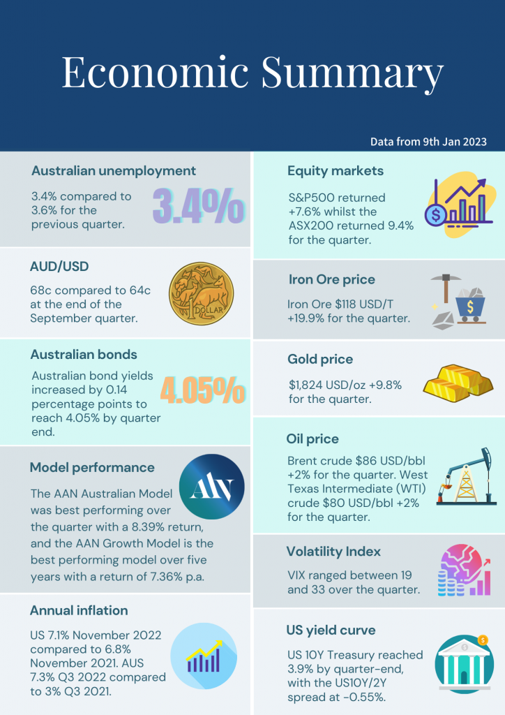 The December quarter saw a weaker USD (-5.5% against the AUD), lower unemployment in Australia, higher commodity prices, higher inflation rates in Australia (and incredibly high compared to a year earlier), a positive quarter for equity markets but volatile, higher Australian 10-year government bond yields, and an inversion of the US 2Y-10Y bond yield spread.