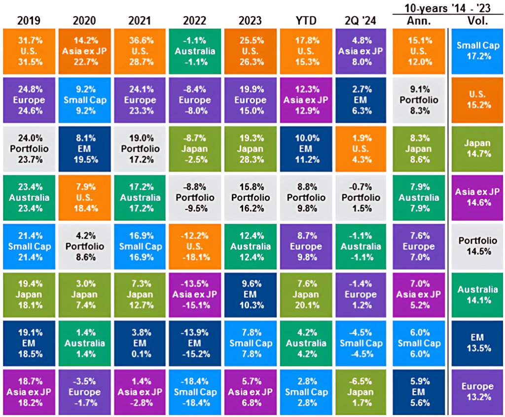 Table 1 below shows how equity markets have moved around over the last five years. The table also includes the second quarter of 2024 and the 2024 year-to-date columns. The top number in each box is in Australian dollar terms and the bottom number if in the local currency, e.g. US = USD.  (The reference portfolio is a JP Morgan Index portfolio and is not investible. The portfolio represents a balanced risk profile.)